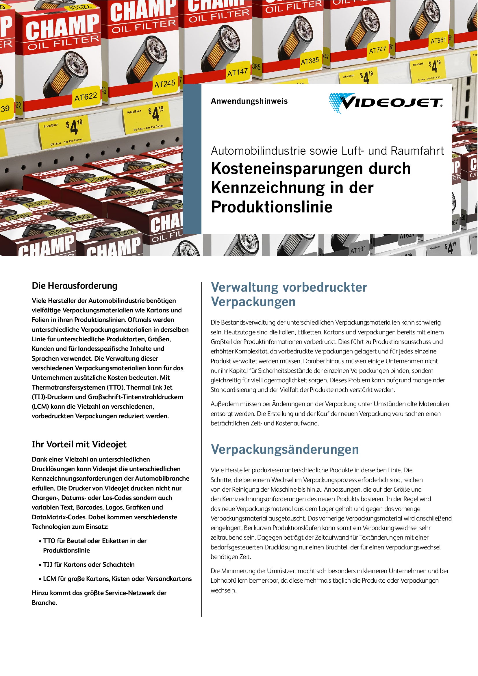 Informationen wie Produktname und Teilenummer werden direkt auf generische Kartons oder Beutel aufgedruckt; sodass die Lagerhaltungskosten sinken. Zudem werden lange Lieferzeiten vorgedruckter Materialien vermieden, und Verpackungsmaterialien können bei Produktionswechseln schneller ausgetauscht werden. Durch bedarfsgesteuerten Druck lassen sich Verpackungskosten senken, Produktionsabläufe vereinfachen und die Produktivität steigern.