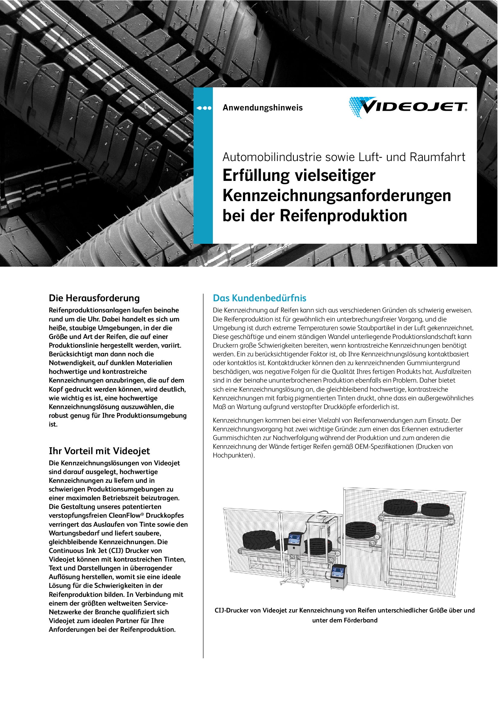 Reifenanlagen sind oft 24 Stunden am Tag und 7 Tage in der Woche in Betrieb. Die hier eingesetzten Codierer drucken ununterbrochen in heißen und staubigen Umgebungen auf dunkle Materialien. Videojet Drucker ermöglichen kontrastreiche Codes mit praktisch verstopfungsfreien Druckköpfen.