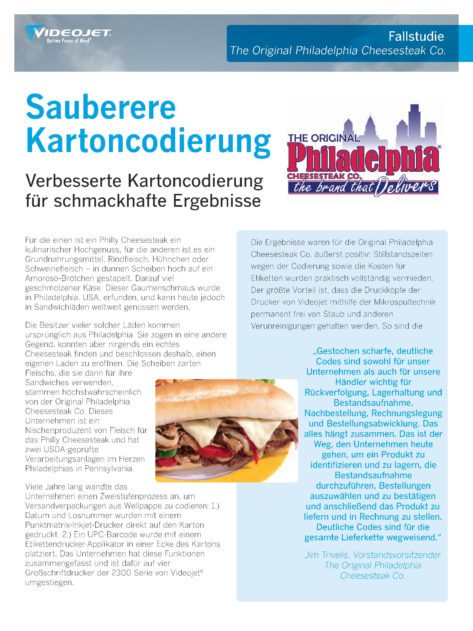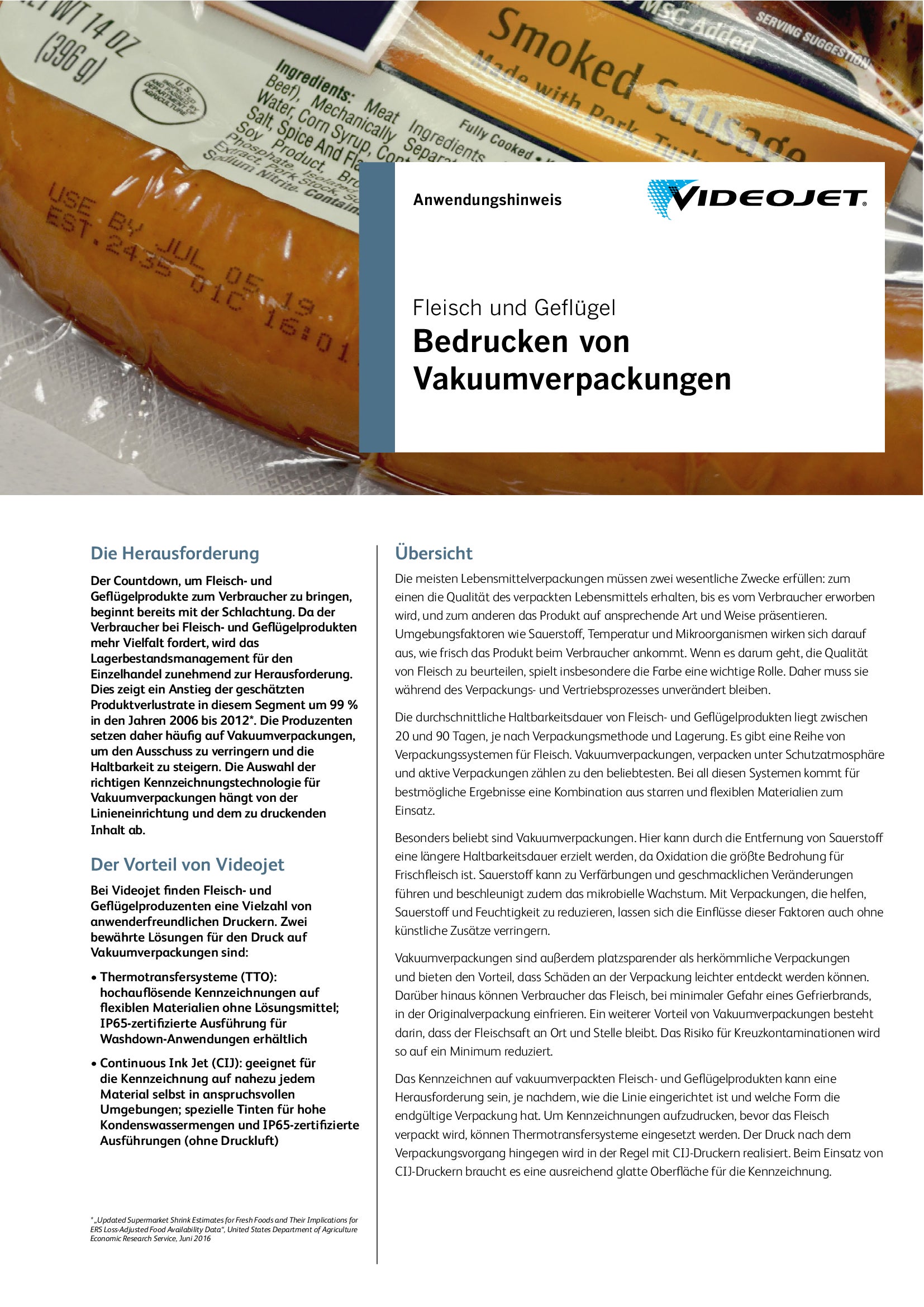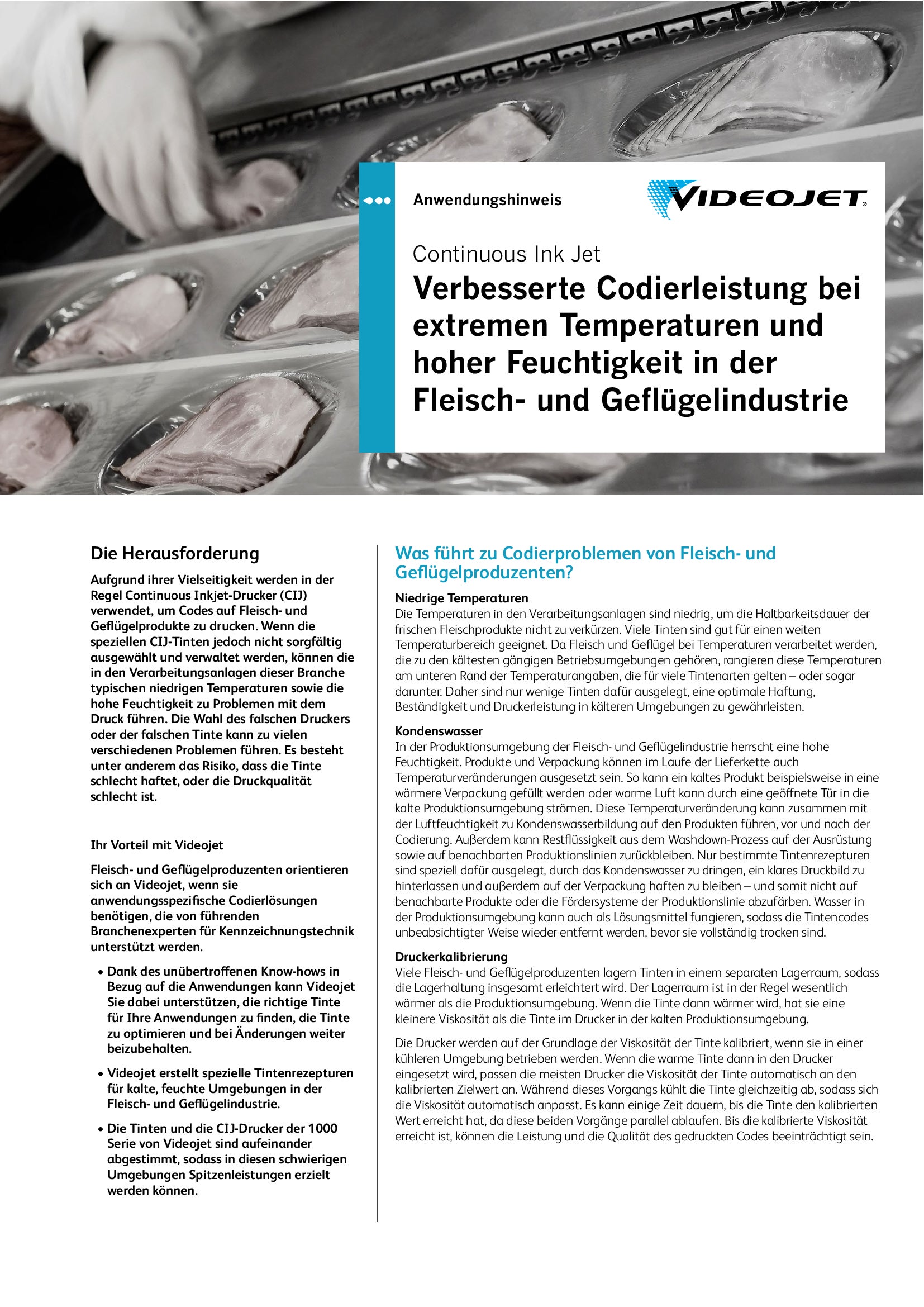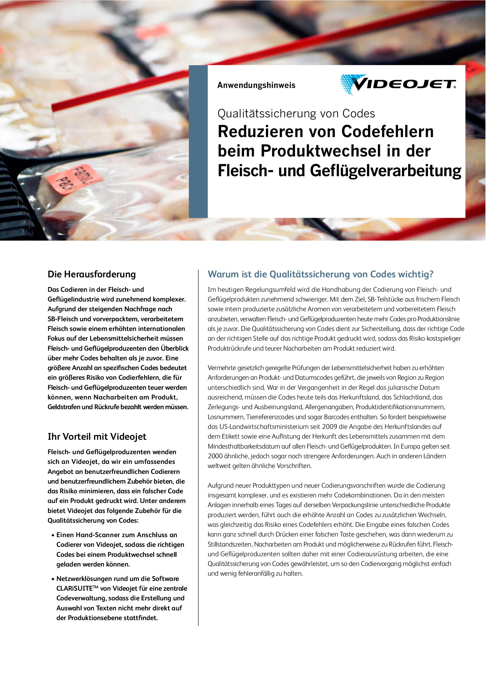 Regularien zur Lebensmittelkennzeichnung, die Implikationen der Produkt-Rückverfolgung wie auch die Anforderungen der Handelsunternehmen machen eine ausnahmslos richtige und lesbare Codierung unabdingar. Ein kompetenter Anbieter von industriellen Kennzeichnungssystemen in stark regulierten Märkten versteht die Bedeutung von hoher Druckqualität und die Wichtigkeit Ihrer betrieblichen Ziele. Videojet verfügt über mehr als 40 Jahre Erfahrung in der Fleisch- und Geflügelbranche und bietet Ihnen die richtige Kombination aus Technologie, Know-how und Serviceoptionen. Damit empfiehlt sich Videojet, der Partner Ihrer Wahl zu sein.