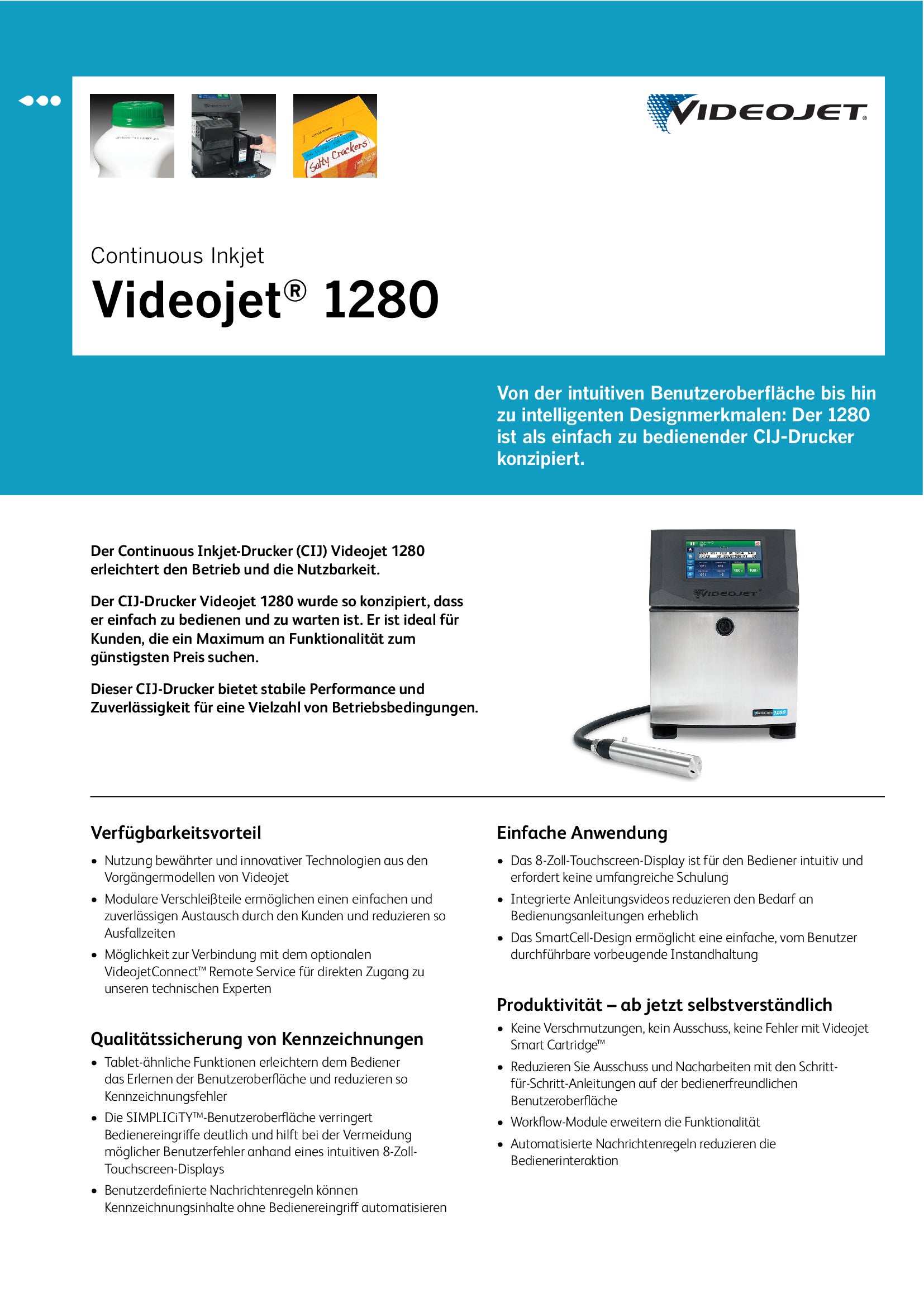 Mit dem Continuous Inkjet-Drucker (CIJ) Videojet 1280 hat Videojet die Simplizität neu definiert. Durch die intuitive Benutzeroberfläche und intelligenten Designmerkmale ist er für alle Bediener einfach zu handhaben.