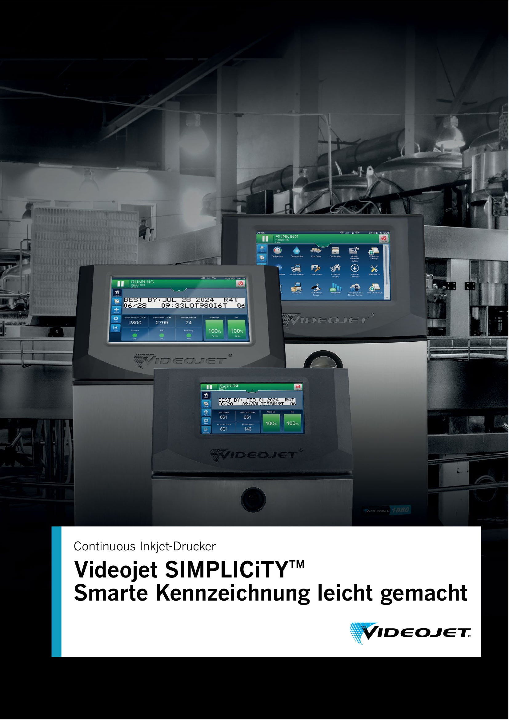 - Die Videojet SIMPLICiTY™-Benutzeroberfläche verringert Bedienereingriffe deutlich und hilft bei der Vermeidung möglicher Benutzerfehler anhand eines intuitiven 8-Zoll-Touchscreen-Displays