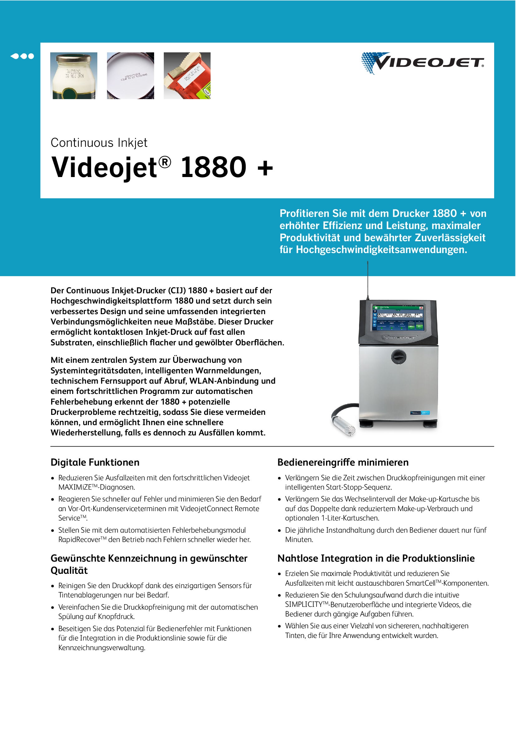 - Der Videojet 1880 + basiert auf der Hochgeschwindigkeitsplattform 1880 und setzt durch sein verbessertes Design und seine umfassenden digitalen Funktionen neue Maßstäbe.
