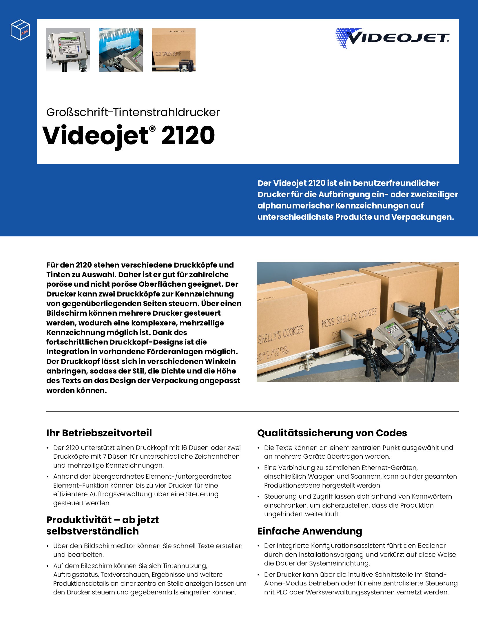 Das Lieferprogramm umfasst mehrere Druckköpfe und Tinten, sodass viele poröse als auch nicht-poröse Oberflächen bedruckt werden können. Der Großschrift-Tintenstrahldrucker Videojet 2120 kann zwei Druckköpfe zur Kennzeichnung auf gegenüberliegenden Verpackungsseiten steuern sowie auch mehrere Systeme mit einem Master für komplexere, mehrzeilige Codes. Vorteile des Beschriftungssystems VJ 2120 im Überblick: