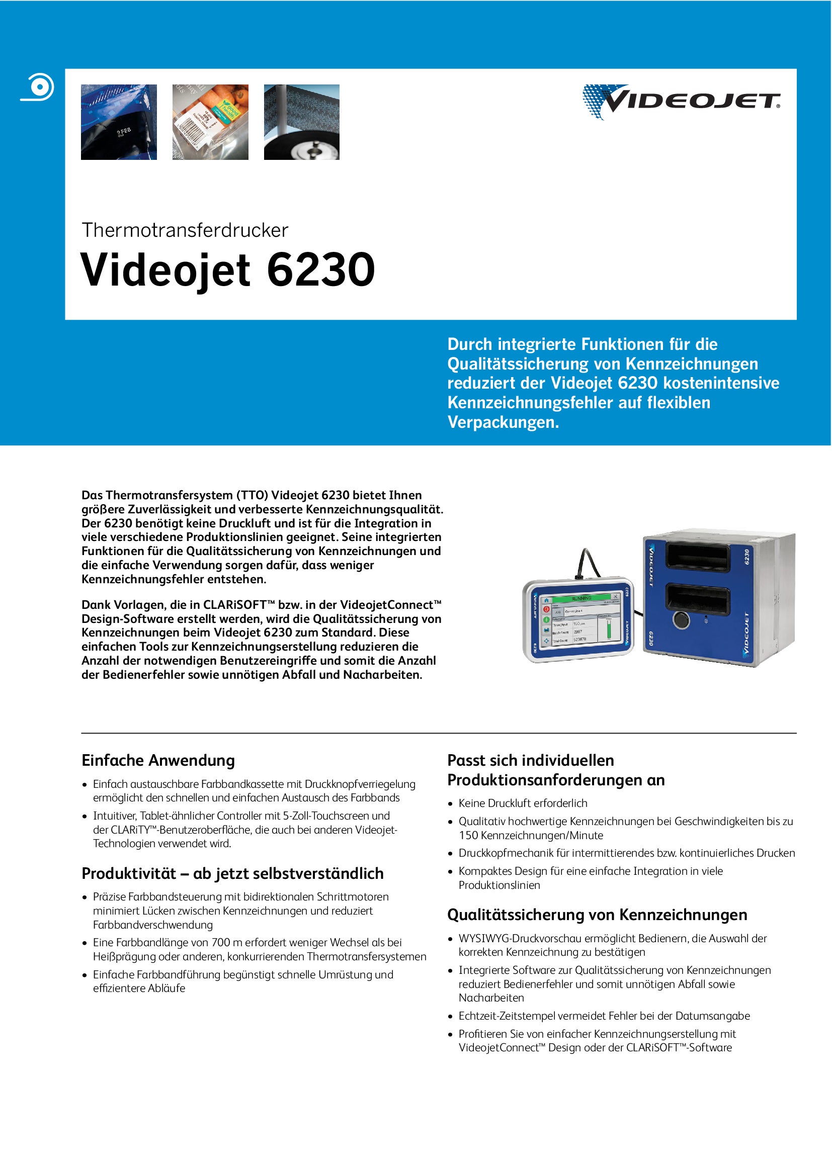 Zusätzlich zu den verfügbaren Features bietet der 6230 qualitativ hochwertige Kennzeichnungen bei Geschwindigkeiten bis zu 150 Verpackungen pro Minute und stellt eine ideale Lösung für Benutzer dar, die von Analoggeräten wie Heißprägern und Rollcodierern zu einer digitalen Lösung wechseln wollen.